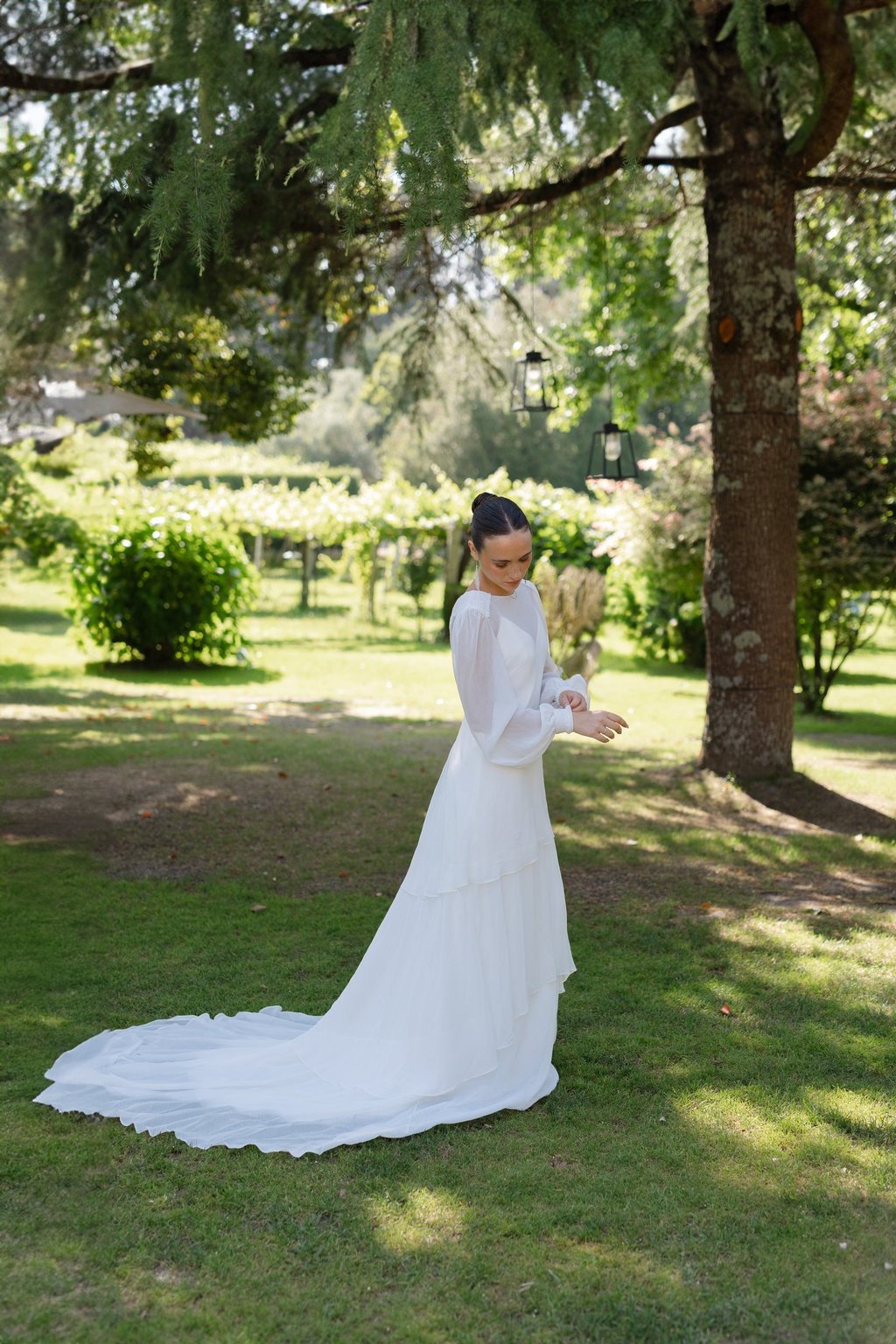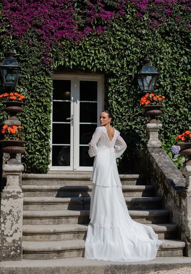 Nos esforzamos por encontrar materiales que no solo fueran hermosos, sino también sostenibles y de la más alta calidad. El triacetato, con su naturaleza transpirable y resistente a las arrugas, se destaca como una opción ideal para novias que buscan comodidad y elegancia. Además, apostamos por la bambula de poliéster reciclado y la organza de seda, reflejando nuestro compromiso con la sostenibilidad y el cuidado del medio ambiente.