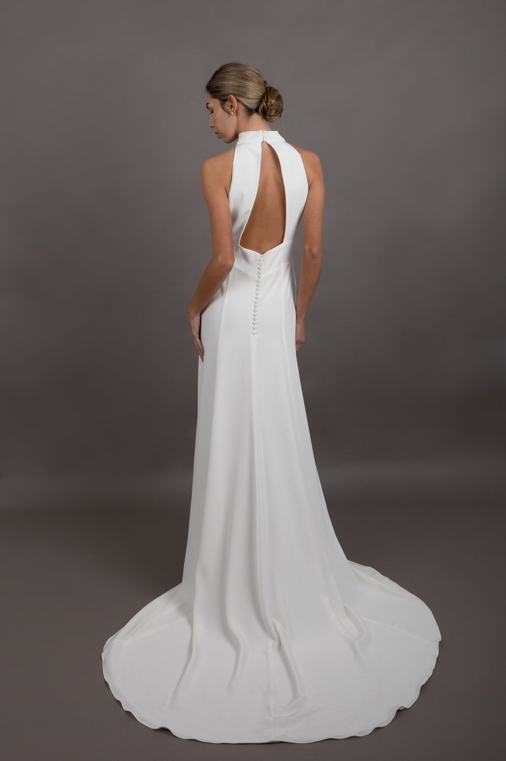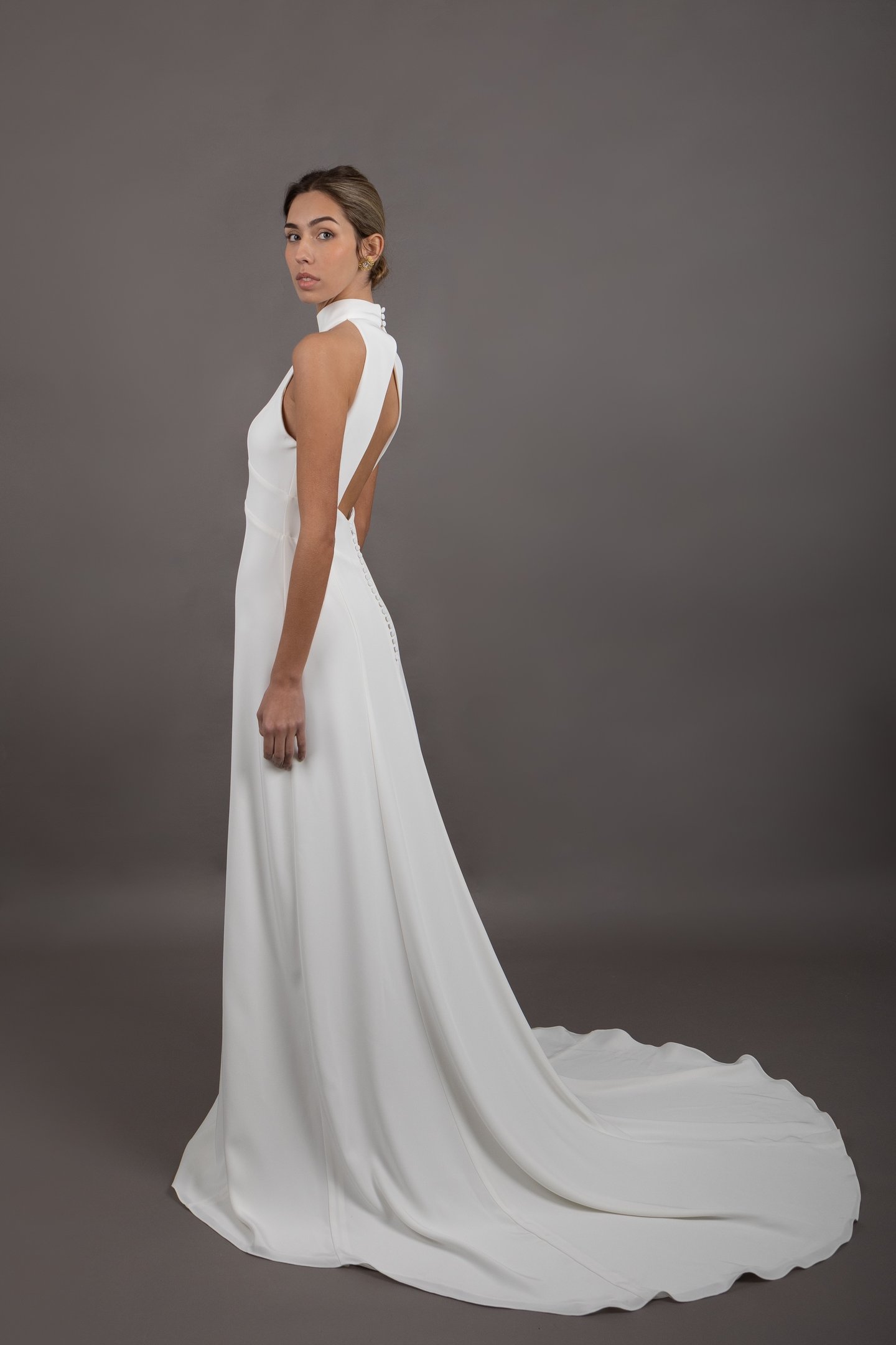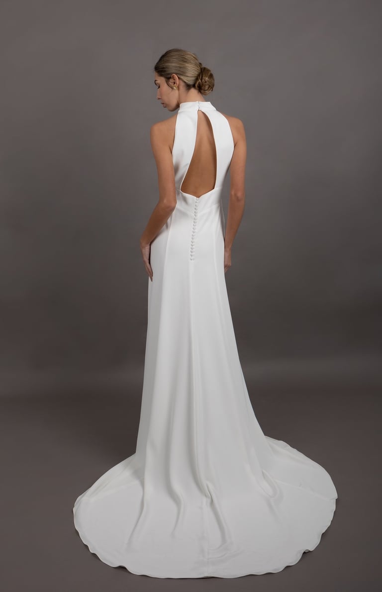 Confeccionado en crepe, este vestido ofrece una caída suave y fluida que añade un movimiento elegante a cada paso. La espalda abierta agrega un toque de sensualidad que cautiva desde todos los ángulos, mientras que su diseño atemporal asegura que sea una opción elegante para cualquier novia.