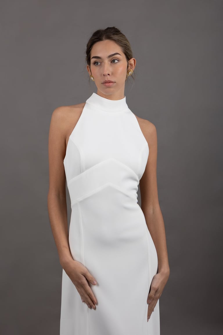 El "Vestido Irene" combina la elegancia clásica con un toque contemporaneo. Su diseño de escote halter con un corte estratégico debajo del pecho resalta la silueta femenina, acentuando la cintura y creando una silueta en forma de "A".
